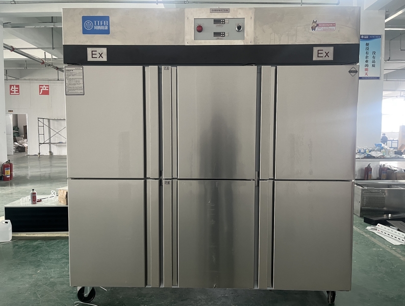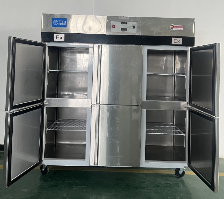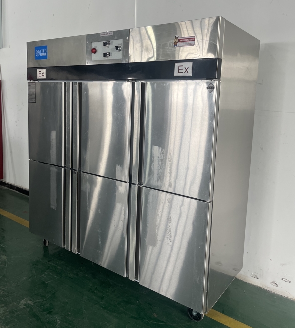 我公司生产的六门不锈钢同腾防爆冰箱(以下简称防爆冰箱),产品防爆要求是根据GB3836.1-2010《爆炸性环境 第1部分:设备 通用要求》、GB3836.2-2010《爆炸性环境 第2部分:由隔爆外壳“d”保护的设备》、GB3836.4-2010《爆炸性环境 第4部分:由本质安全型“i”保护的设备》、GB3836.9-2006《爆炸性气体环境用电气设备 第9部分 浇封型“m”》及GB3836.15-2017《爆炸性气体环境用电气设备 第15部分:电气装置的设计、选型和安装》的规定制成防爆结构,经国家授权的质量监督检验部门检验合格,其防爆标志为ExdbibmbⅡCT4 Gb。适用于工厂存在或可能存在ⅡA、ⅡB级、ⅡC,T1~T4组可燃性气体、蒸气与空气混合形成的爆炸危险1区或2区场所。该产品经国家防爆电气产品质量监督检验中心检验合格并取得了防爆合格证。空调机广泛适用于石油、化工、冶金、制药和国防工业等空气中存在爆炸性气体混合物的自封闭的室内之用。